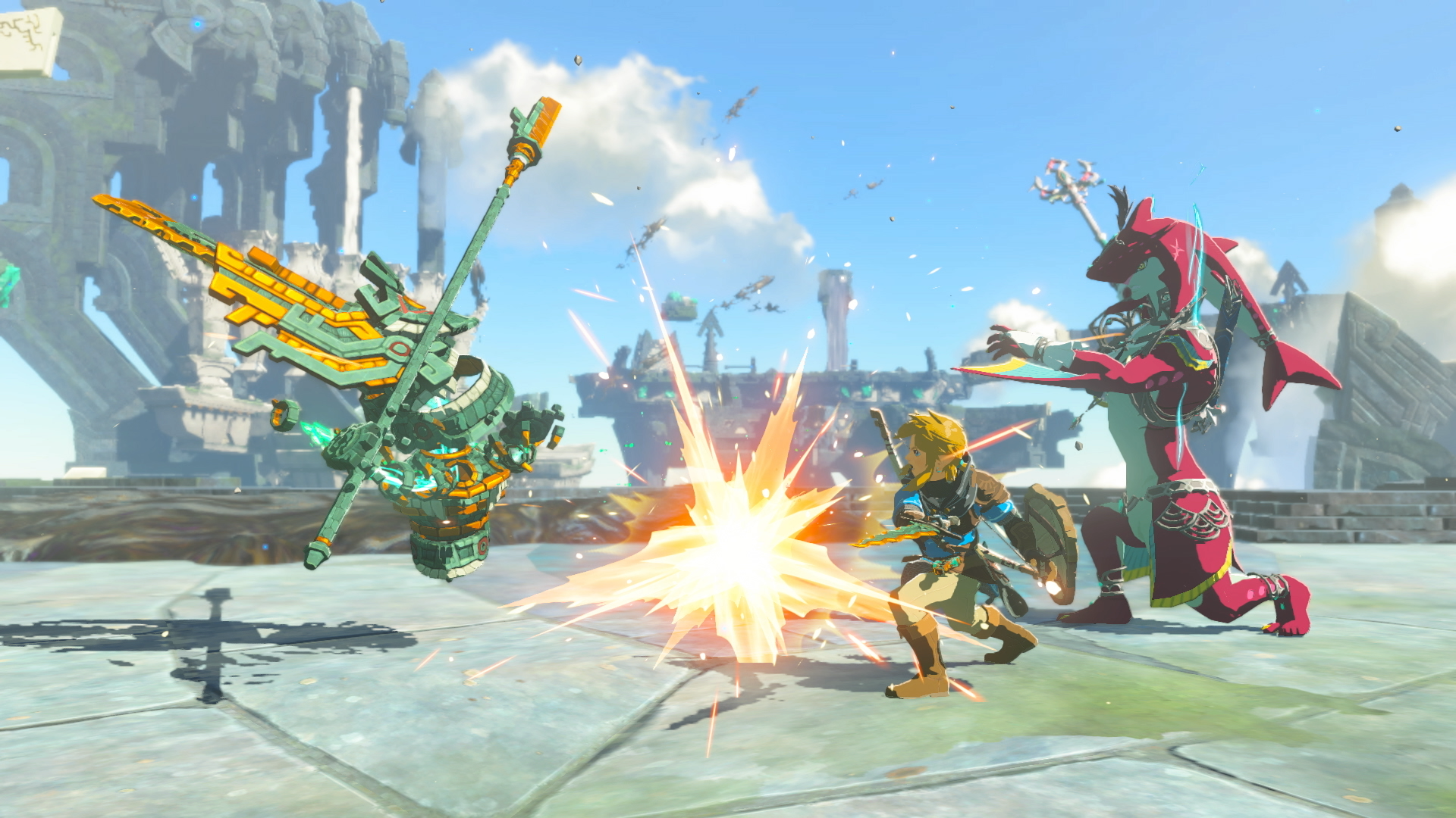 Letโs take combat for example. Itโs fundamentally the same as in Breath of the Wild with largely the same enemies, but the ways in which you can implement Linkโs new abilities have elevated it. Some enemies, such as the new Flux Constructs, outright require you to make use of your different Zonai abilities in order to take them down, making for some really fun fights. I could try jumping on a Talos and climbing its back to get on top of it, or I could use Recall on the stones it throws to stun it and climb without issue. I could also run underneath it and use Ascend to get on top in a flash. Sticking multiple explosives to each other with Ultrahand was a great way to get the drop on sleeping enemies, or even against ones that were charging right at me. I could even use Fuse to make a Mirror Shield that momentarily stuns enemies that you point its light at or a sword that spews flames with each swing.