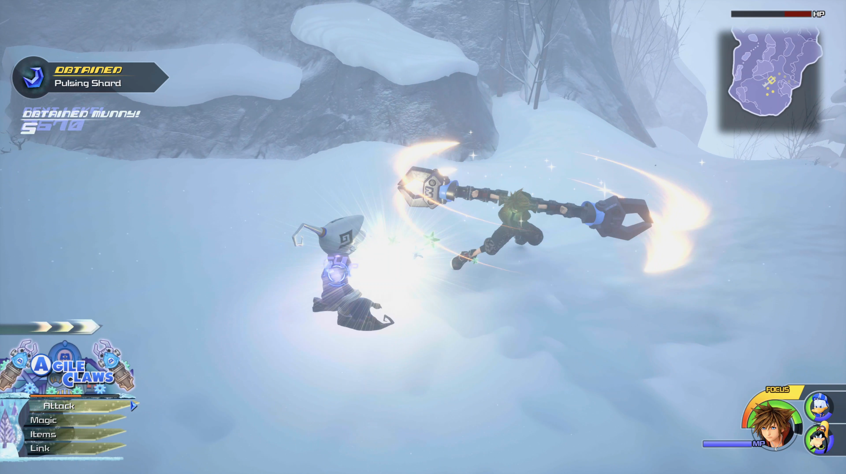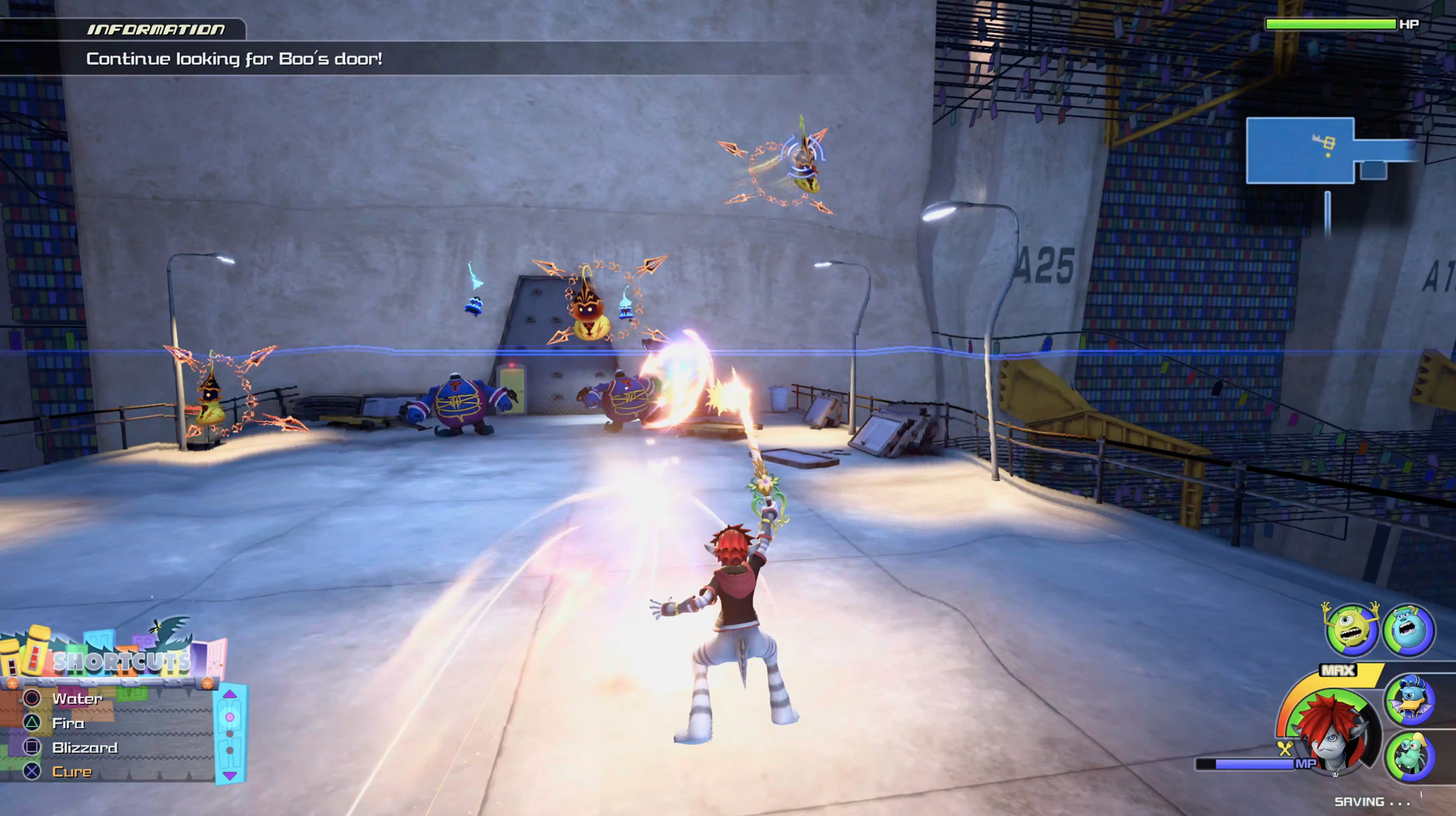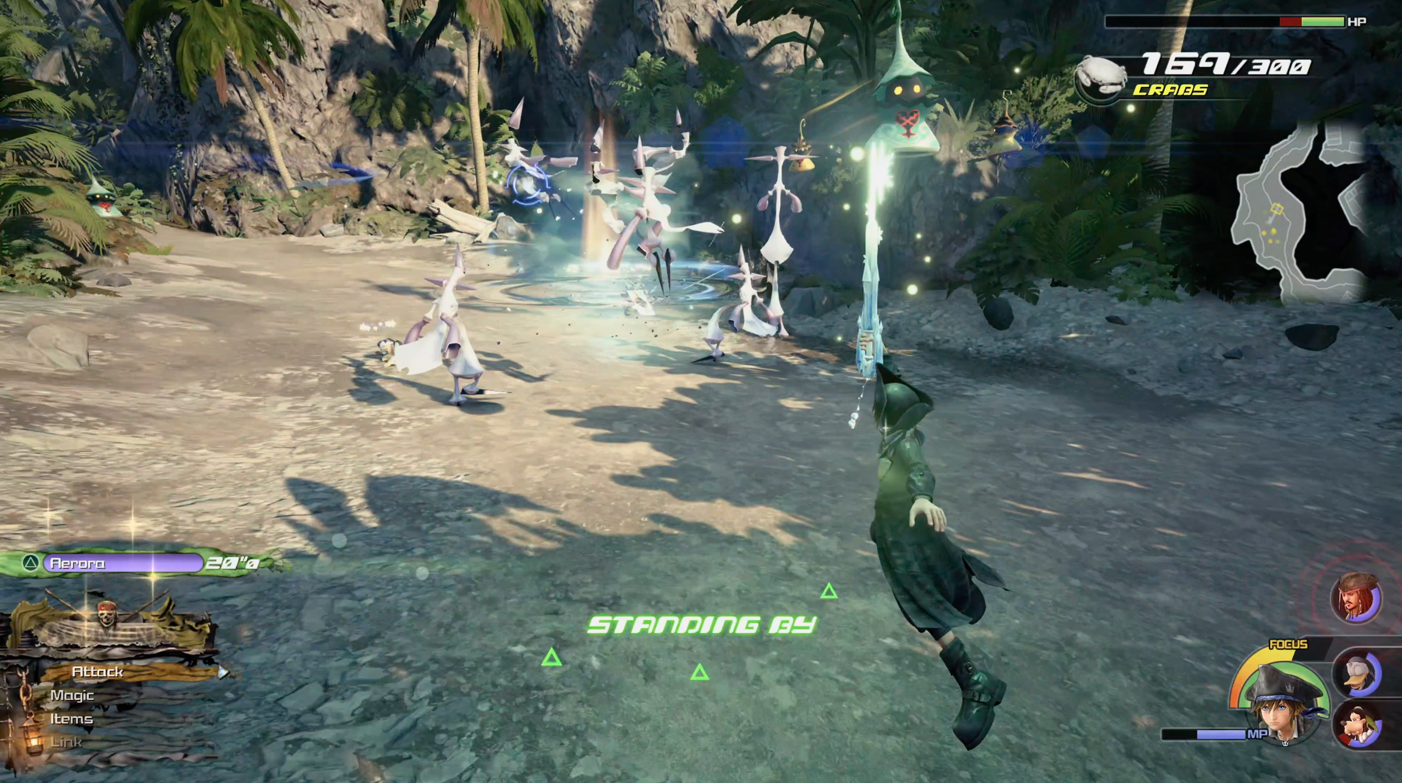 That’s not the only change to magic that makes an impact. On a smaller scale, certain spells like Blizzard and Aero leave residual effects like ice trails and wind funnels that can be used for Flowmotion. On a larger scale, magic plays a more strategic role in taking down certain enemies. The Water Core and Flame Core Heartless enemies will enter forms where they can only be damaged by the element that’s counter to them. Regular attacks can be used to take down large dandelion Heartless, but casting Aero on them will make them significantly easier to manage. Most of these changes may not seem like a big deal in the grand scheme of things, but they add up and fundamentally impact how fights play out.